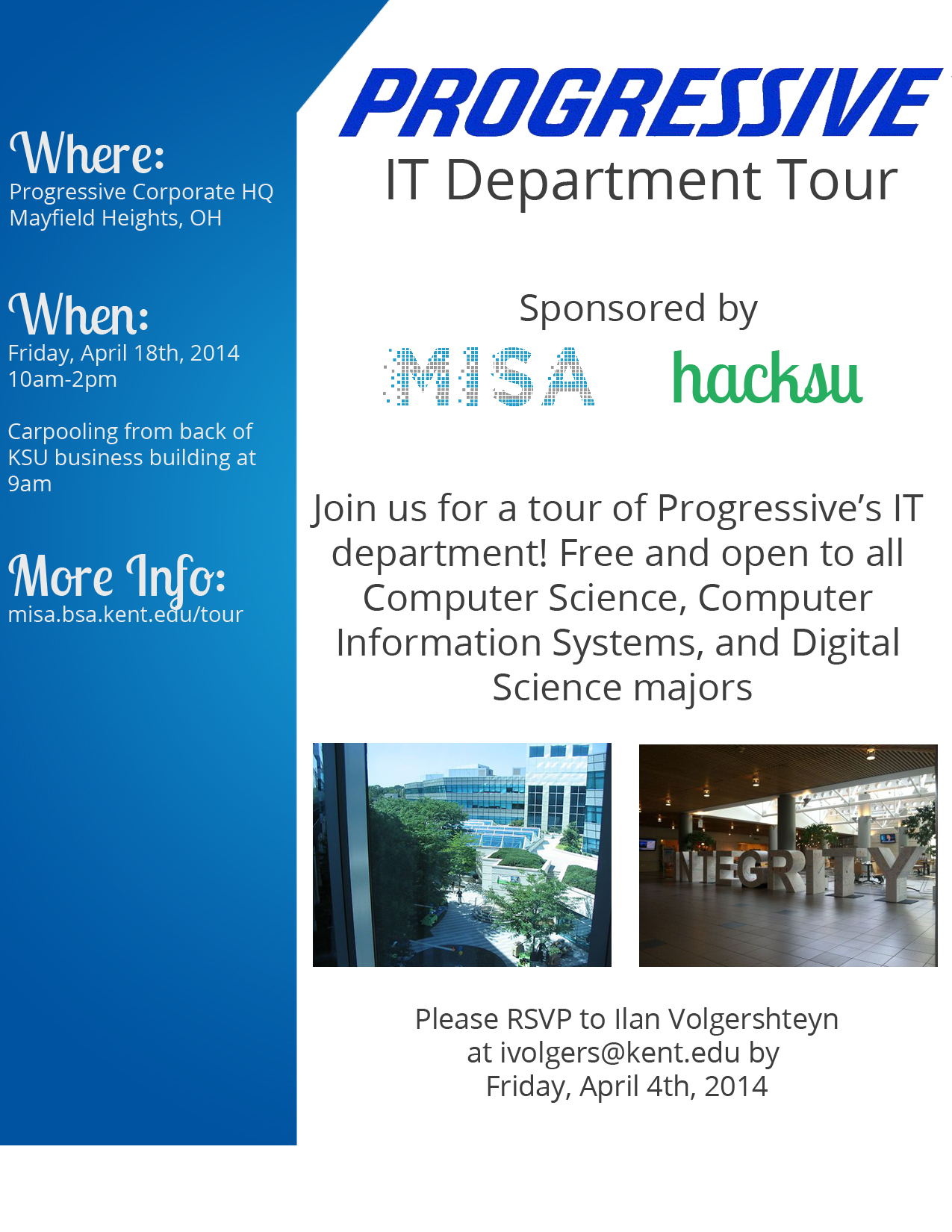 > Attached is the flyer created by MISA for the upcoming site visit to Progressive on April 18th. At this point we have 12 confirmed attendees. I’d like to get more students to attend – it’s going to be a great visit and anything we can do to promote it would be appreciated.